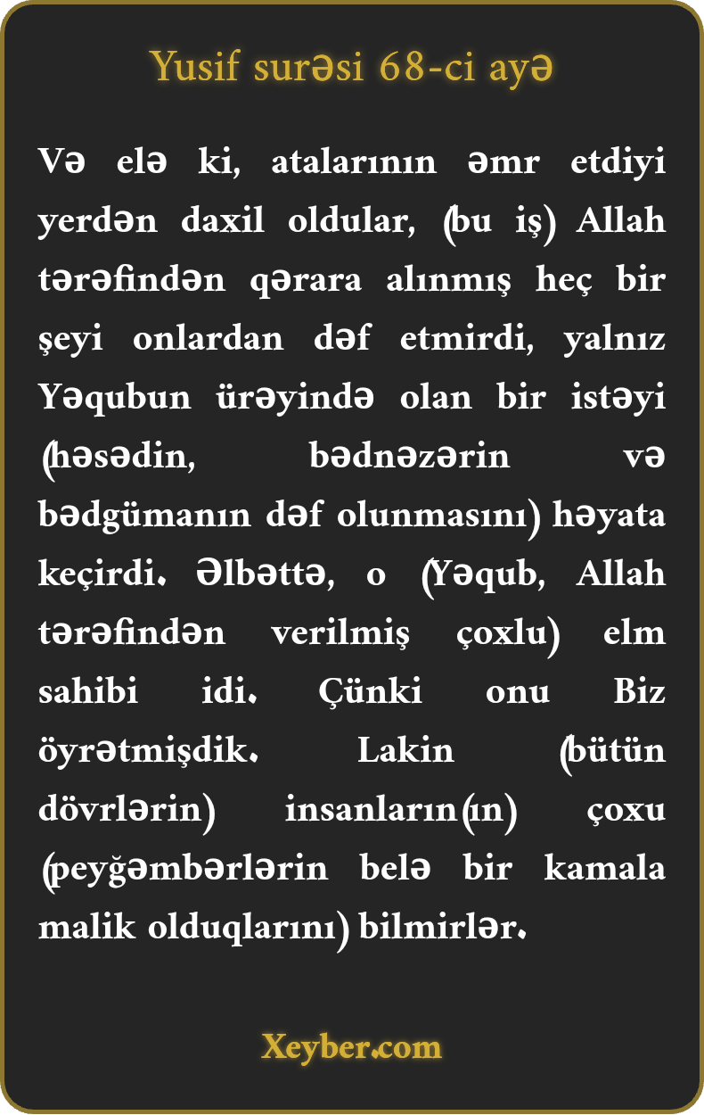 "Atalarının göstərdiyi yerdən daxil olsalar da, bu iş Allahın iradəsi qarşısında onlara heç bir fayda vermədi. Yalnız Yəqubun qəlbində olan ehtiyat yerinə yetmiş oldu. (Ayrı-ayrı qapıdan daxil olmağın faydası gözdəymədən qorunmaları və xüsusi ilə Benyaminin Yusifə yetişməsi oldu.) Əlbəttə ki, (Yəqub) ona öyrətdiklərimizə xatir elmə sahib idi. Amma xalqın çoxu agah deyil.”