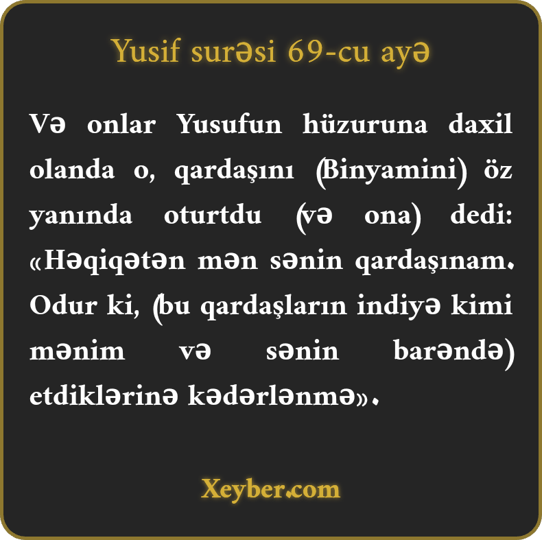 "(Qardaşları) Yusifin yanına gəldikləri vaxt o, qardaşına (Benyaminə) yanında yer verib dedi: "Həqiqətən, mən sənin qardaşınam, onların gördüyü iş səni qəmləndirməsin.”