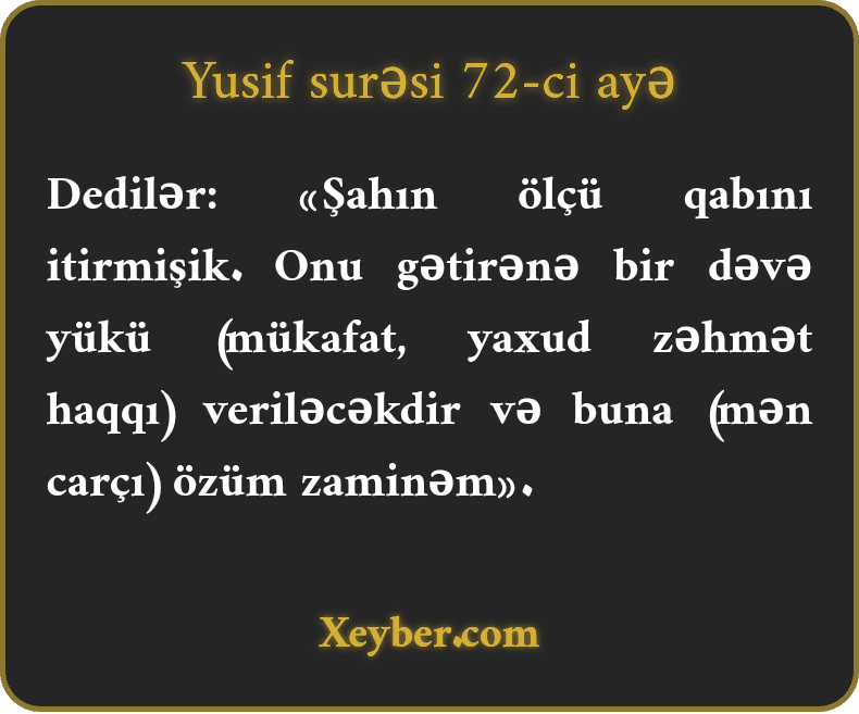 "Dedilər: "Şaha məxsus qabı itirmişik. Onu tapıb gətirənə bir dəvə yükü veriləcək, mən buna zaminəm.”