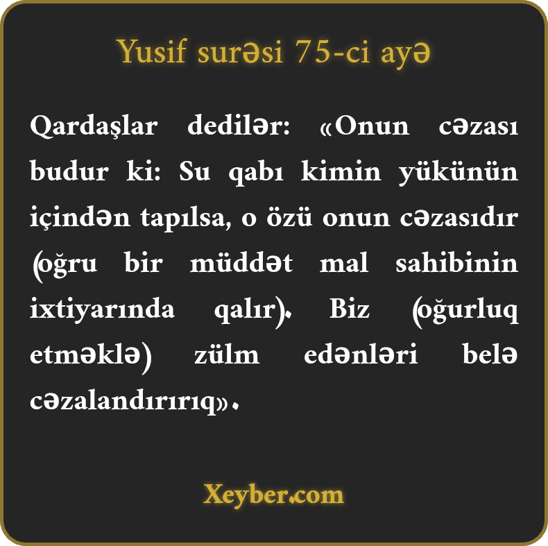 "Dedilər: "Cəzası belədir ki, peymanə (qab) kimin yükündən tapılsa, o özü oğurluğun cəriməsidir. (Girov və ya qul kimi peymanə sahibinin ixtiyarına verilməlidir.) Biz (Kənan əhli) zalımı belə cəzalandırırıq.”