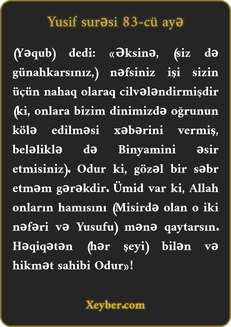 "(Yəqub) dedi: (Belə deyil,) əslində nəfsiniz bu məsələni sizin gözünüzdə bəzəmişdir. Gözəl səbir (lazımdır), ümid var ki, Allah bütün qardaşları birlikdə mənim yanıma gətirsin. Çünki O, həqiqətən agahdır və hikmət sahibidir.”