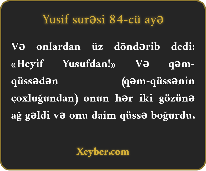"Yəqub övladlarından üz döndərdi və dedi: "Heyif Yusifdən.” Öz səsini uddu, dərddən iki gözü ağardı (kor oldu).”