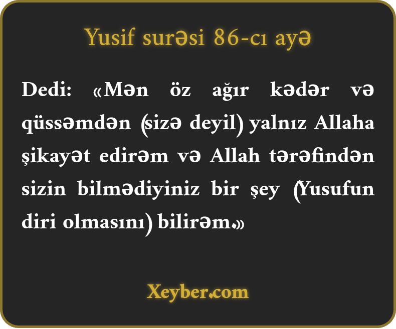 "(Yəqub) dedi: "Mən nalə və hüznümlə yalnız Allaha şikayət edirəm və Allahdan (Onun lütfündən) sizin bilmədiyinizi bilirəm.”