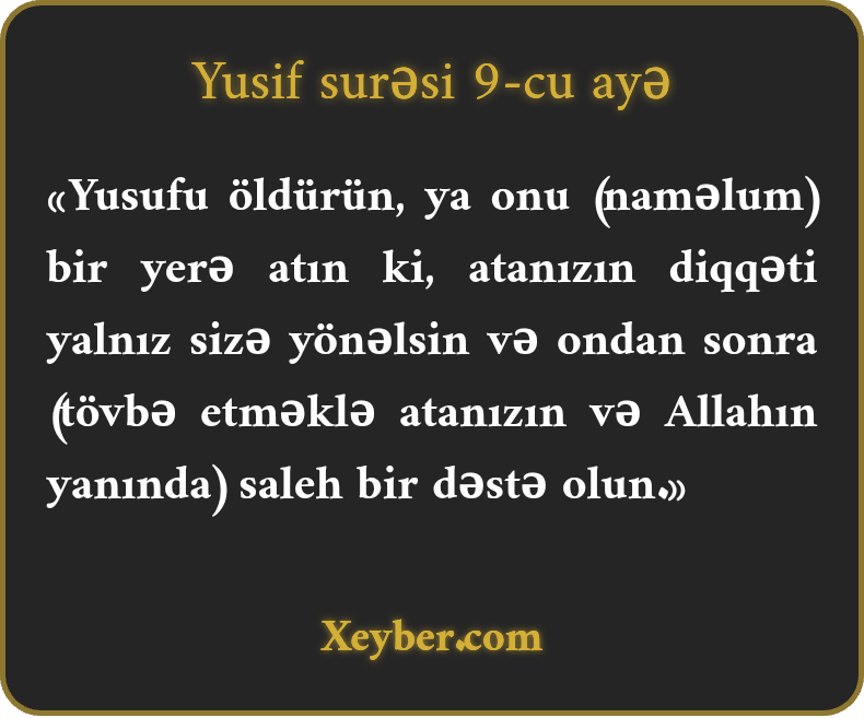 "(Qardaşlardan biri dedi:) Yusifi öldürün, ya uzaq bir yerə atın ki, atanızın diqqəti sizə məxsus olsun. Ondan sonra (tövbə edib) saleh bir qrup olun.”