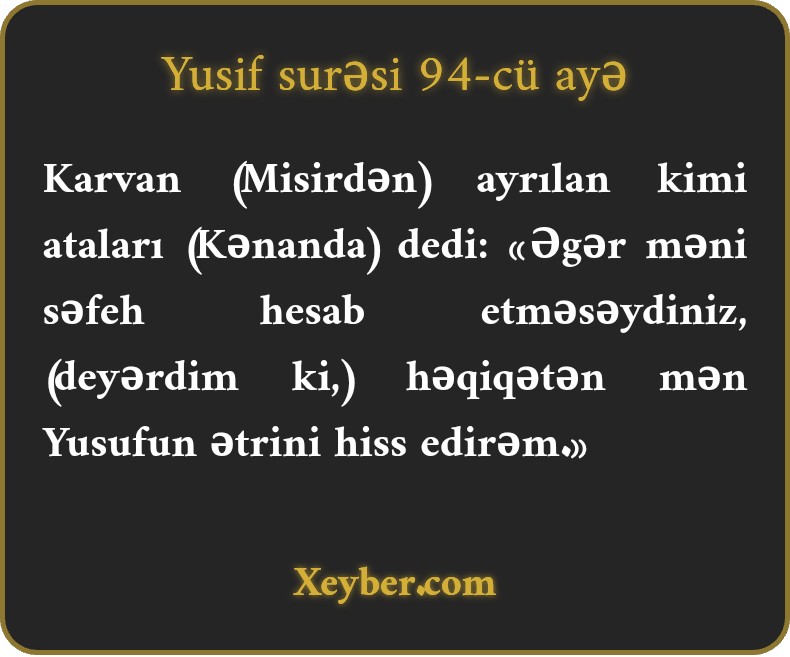 "Elə ki, karvan yola düşdü, ataları dedi: "Həqiqətən Yusifin qoxusunu duyuram. Əlbəttə ki, əgər məni yüngülbeyin saymasanız!”