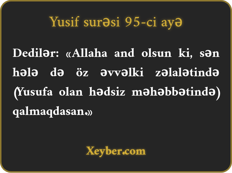 Bu surənin 8-ci ayəsində oxuduq ki, qardaşlar öz ataları haqqında dedilər: "Atamız Yusifə və onun qardaşına yersiz məhəbbəti səbəbindən aşkar azğınlıqdadır.” Burada isə belə deyilir: "Sən keçmişdəki yanlışlıqdasan.”
