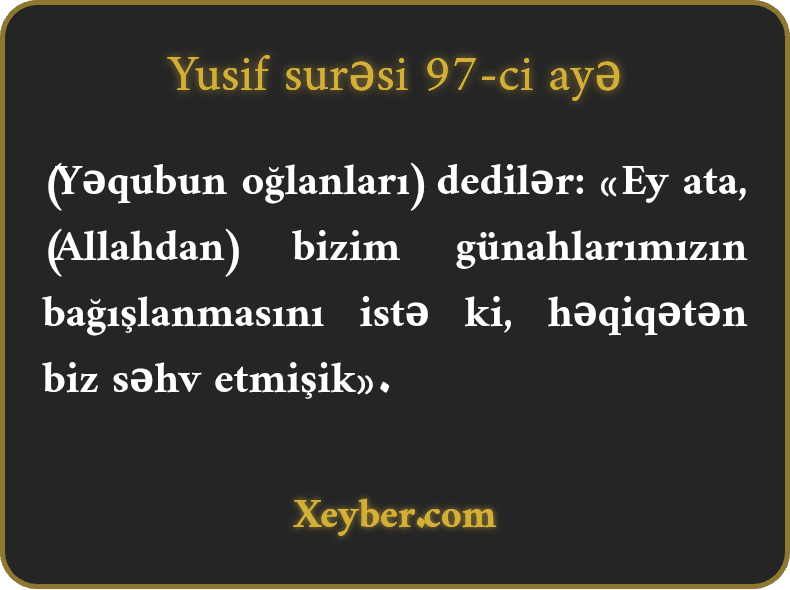 "(Övladlar) Dedilər: Ey ata! Bizim günahlarımız üçün (Allahdan) bağışlanma dilə. Həqiqətən, biz xətakar olmuşuq.”