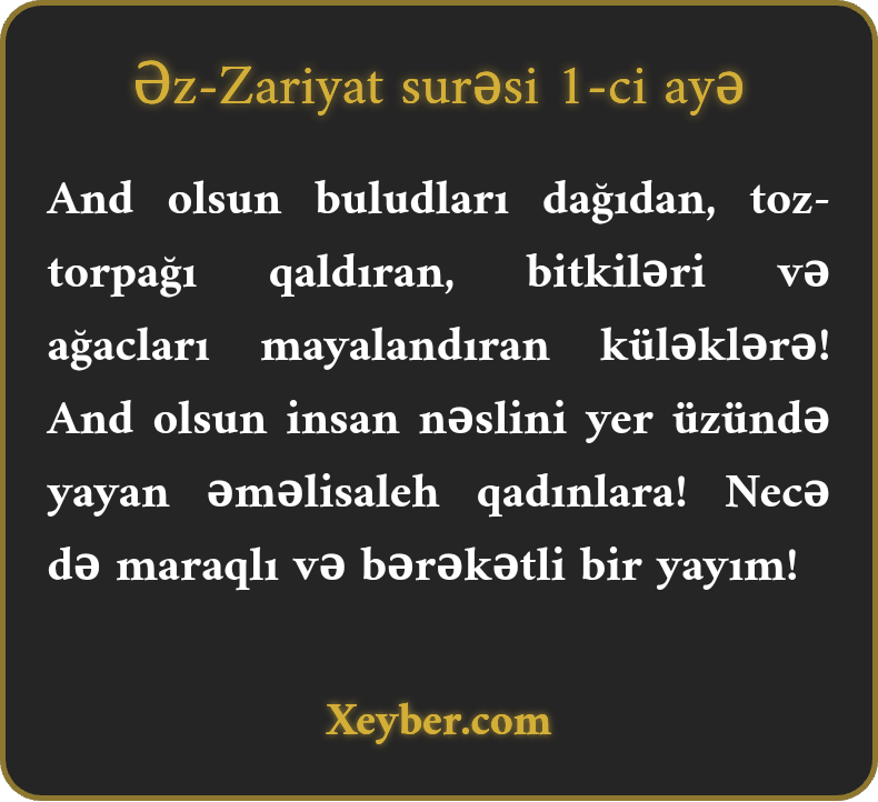 And olsun buludları dağıdan, toz-torpağı qaldıran, bitkiləri və ağacları mayalandıran küləklərə! And olsun insan nəslini yer üzündə yayan əməlisaleh qadınlara! Necə də maraqlı və bərəkətli bir yayım!