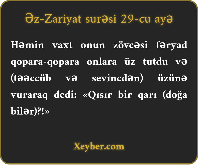 Həmin vaxt onun zövcəsi fəryad qopara-qopara onlara üz tutdu və (təəccüb və sevincdən) üzünə vuraraq dedi: «Qısır bir qarı (doğa bilər)?!»