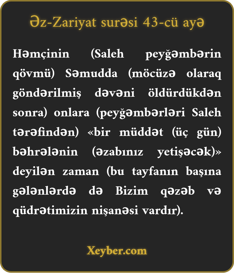 Həmçinin (Saleh peyğəmbərin qövmü) Səmudda (möcüzə olaraq göndərilmiş dəvəni öldürdükdən sonra) onlara (peyğəmbərləri Saleh tərəfindən) «bir müddət (üç gün) bəhrələnin (əzabınız yetişəcək)» deyilən zaman (bu tayfanın başına gələnlərdə də Bizim qəzəb və qüdrətimizin nişanəsi vardır).