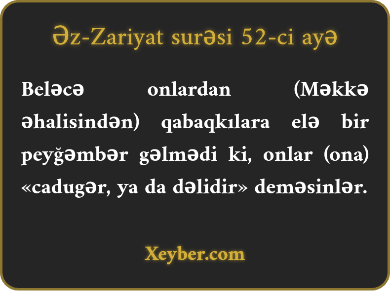 Beləcə onlardan (Məkkə əhalisindən) qabaqkılara elə bir peyğəmbər gəlmədi ki, onlar (ona) «cadugər, ya da dəlidir» deməsinlər.