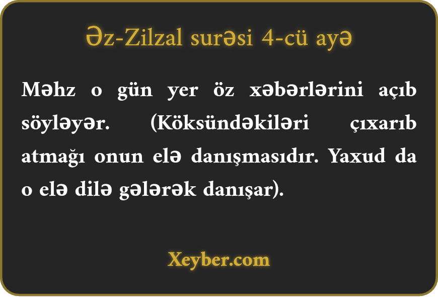 Məhz o gün yer öz xəbərlərini açıb söyləyər. (Köksündəkiləri çıxarıb atmağı onun elə danışmasıdır. Yaxud da o elə dilə gələrək danışar).
