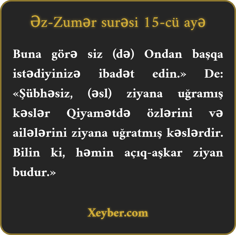 Buna görə siz (də) Ondan başqa istədiyinizə ibadət edin.» De: «Şübhəsiz, (əsl) ziyana uğramış kəslər Qiyamətdə özlərini və ailələrini ziyana uğratmış kəslərdir. Bilin ki, həmin açıq-aşkar ziyan budur.»