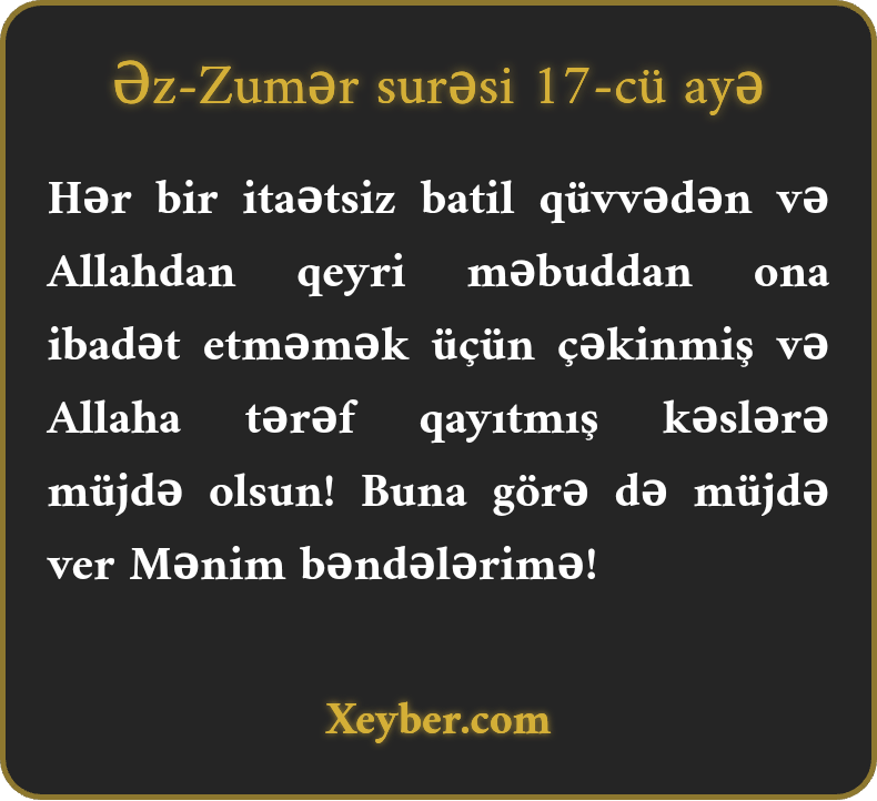 Hər bir itaətsiz batil qüvvədən və Allahdan qeyri məbuddan ona ibadət etməmək üçün çəkinmiş və Allaha tərəf qayıtmış kəslərə müjdə olsun! Buna görə də müjdə ver Mənim bəndələrimə!