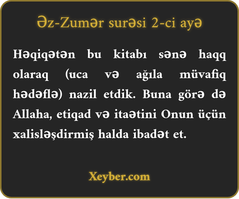 Həqiqətən bu kitabı sənə haqq olaraq (uca və ağıla müvafiq hədəflə) nazil etdik. Buna görə də Allaha, etiqad və itaətini Onun üçün xalisləşdirmiş halda ibadət et.