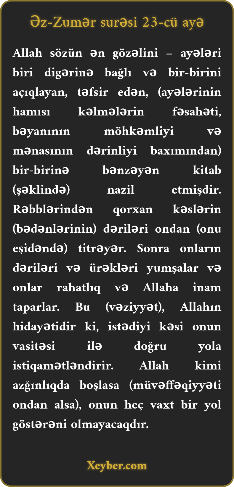 Allah sözün ən gözəlini – ayələri biri digərinə bağlı və bir-birini açıqlayan, təfsir edən, (ayələrinin hamısı kəlmələrin fəsahəti, bəyanının möhkəmliyi və mənasının dərinliyi baxımından) bir-birinə bənzəyən kitab (şəklində) nazil etmişdir. Rəbblərindən qorxan kəslərin (bədənlərinin) dəriləri ondan (onu eşidəndə) titrəyər. Sonra onların dəriləri və ürəkləri yumşalar və onlar rahatlıq və Allaha inam taparlar. Bu (vəziyyət), Allahın hidayətidir ki, istədiyi kəsi onun vasitəsi ilə doğru yola istiqamətləndirir. Allah kimi azğınlıqda boşlasa (müvəffəqiyyəti ondan alsa), onun heç vaxt bir yol göstərəni olmayacaqdır.
