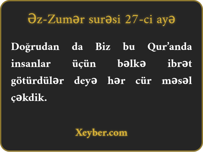 Doğrudan da Biz bu Qur’anda insanlar üçün bəlkə ibrət götürdülər deyə hər cür məsəl çəkdik.