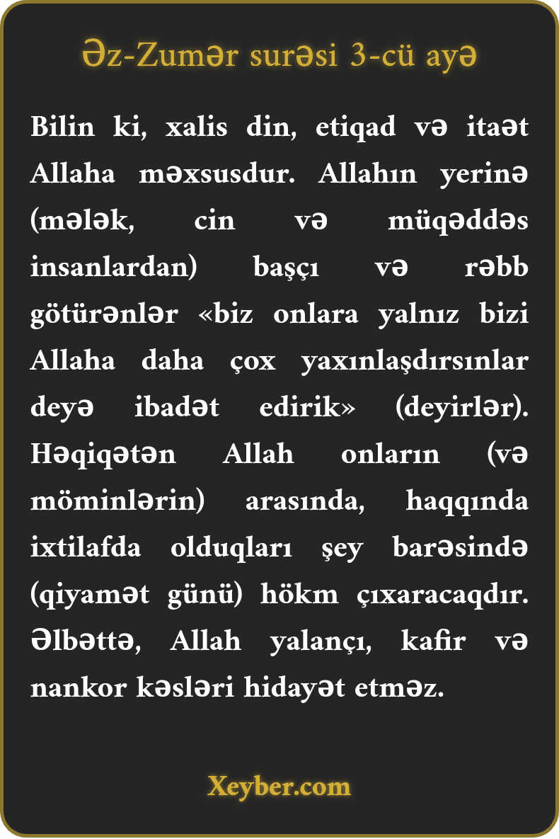 Bilin ki, xalis din, etiqad və itaət Allaha məxsusdur. Allahın yerinə (mələk, cin və müqəddəs insanlardan) başçı və rəbb götürənlər «biz onlara yalnız bizi Allaha daha çox yaxınlaşdırsınlar deyə ibadət edirik» (deyirlər). Həqiqətən Allah onların (və möminlərin) arasında, haqqında ixtilafda olduqları şey barəsində (qiyamət günü) hökm çıxaracaqdır. Əlbəttə, Allah yalançı, kafir və nankor kəsləri hidayət etməz.