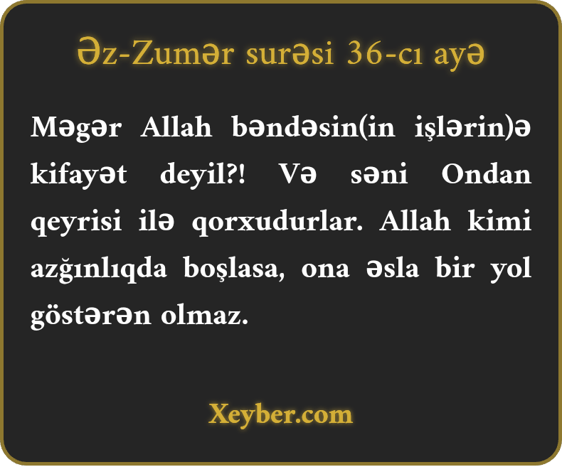 Məgər Allah bəndəsin(in işlərin)ə kifayət deyil?! Və səni Ondan qeyrisi ilə qorxudurlar. Allah kimi azğınlıqda boşlasa, ona əsla bir yol göstərən olmaz.