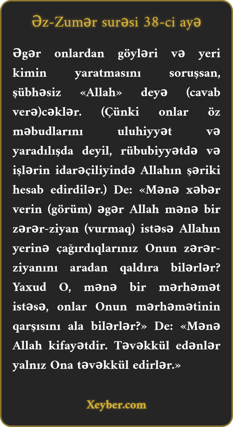 Əgər onlardan göyləri və yeri kimin yaratmasını soruşsan, şübhəsiz «Allah» deyə (cavab verə)cəklər. (Çünki onlar öz məbudlarını uluhiyyət və yaradılışda deyil, rübubiyyətdə və işlərin idarəçiliyində Allahın şəriki hesab edirdilər.) De: «Mənə xəbər verin (görüm) əgər Allah mənə bir zərər-ziyan (vurmaq) istəsə Allahın yerinə çağırdıqlarınız Onun zərər-ziyanını aradan qaldıra bilərlər? Yaxud O, mənə bir mərhəmət istəsə, onlar Onun mərhəmətinin qarşısını ala bilərlər?» De: «Mənə Allah kifayətdir. Təvəkkül edənlər yalnız Ona təvəkkül edirlər.»