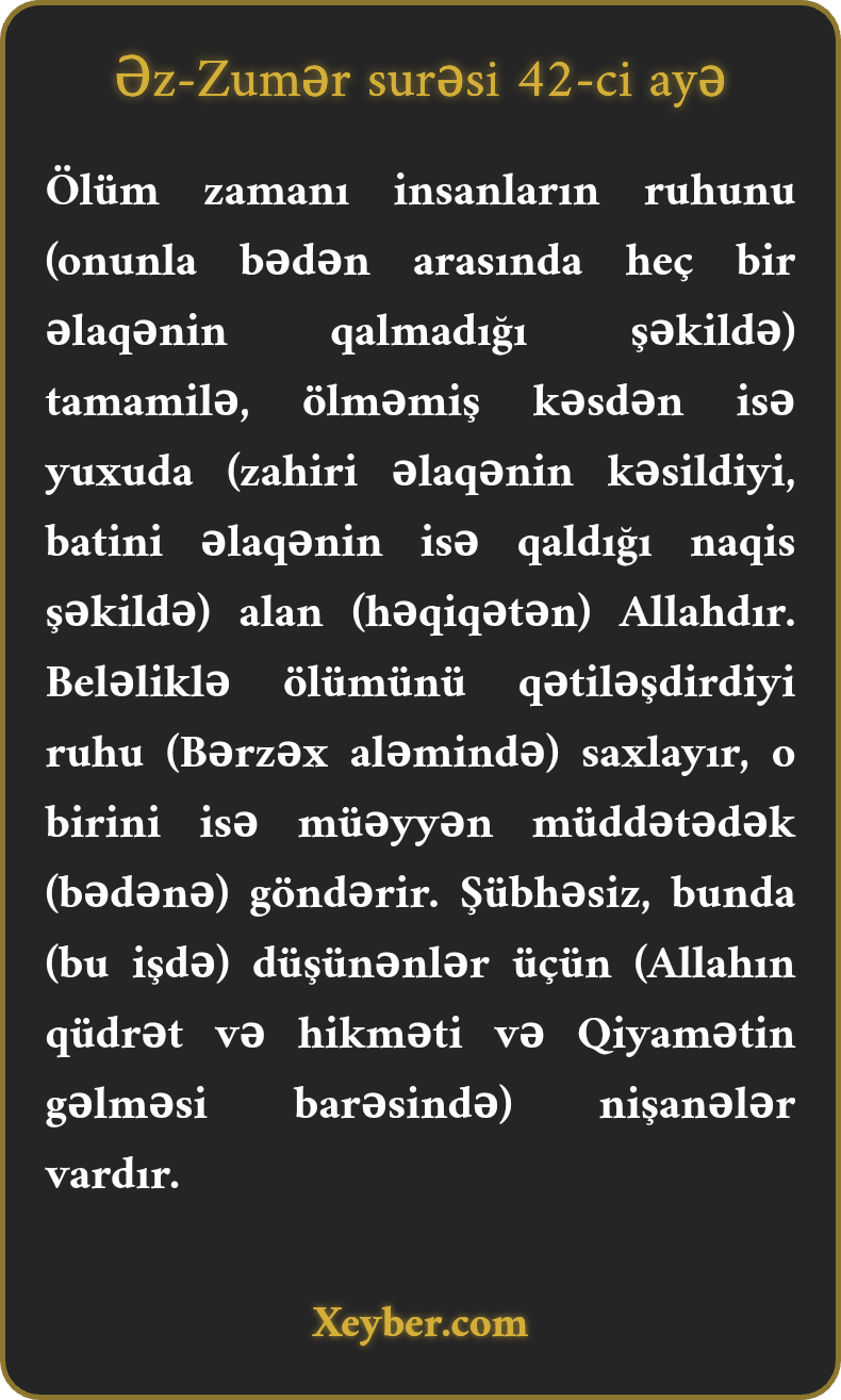 Ölüm zamanı insanların ruhunu (onunla bədən arasında heç bir əlaqənin qalmadığı şəkildə) tamamilə, ölməmiş kəsdən isə yuxuda (zahiri əlaqənin kəsildiyi, batini əlaqənin isə qaldığı naqis şəkildə) alan (həqiqətən) Allahdır. Beləliklə ölümünü qətiləşdirdiyi ruhu (Bərzəx aləmində) saxlayır, o birini isə müəyyən müddətədək (bədənə) göndərir. Şübhəsiz, bunda (bu işdə) düşünənlər üçün (Allahın qüdrət və hikməti və Qiyamətin gəlməsi barəsində) nişanələr vardır.