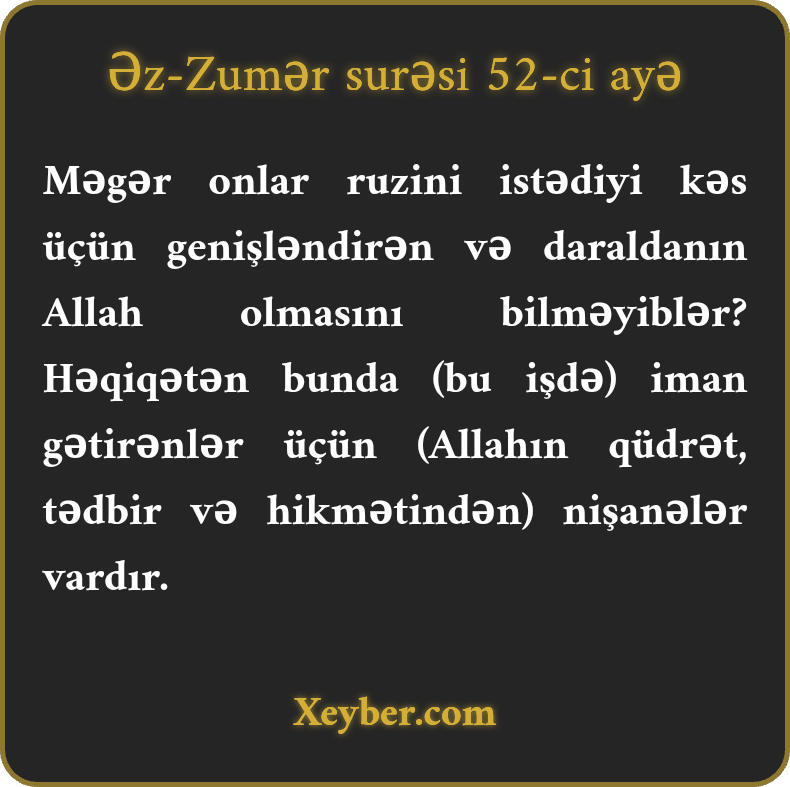 Məgər onlar ruzini istədiyi kəs üçün genişləndirən və daraldanın Allah olmasını bilməyiblər? Həqiqətən bunda (bu işdə) iman gətirənlər üçün (Allahın qüdrət, tədbir və hikmətindən) nişanələr vardır.