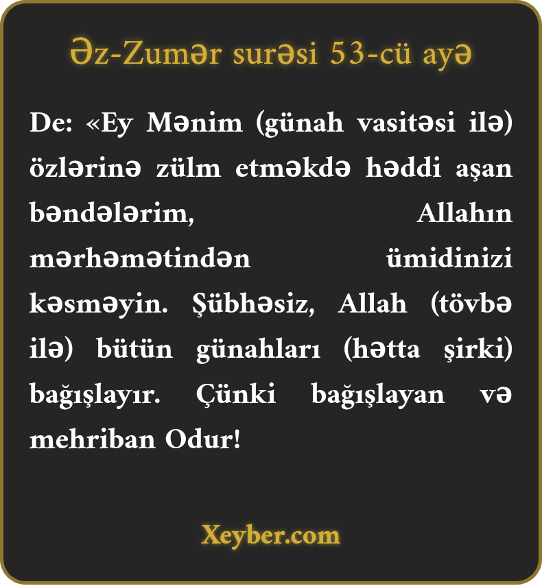 De: «Ey Mənim (günah vasitəsi ilə) özlərinə zülm etməkdə həddi aşan bəndələrim, Allahın mərhəmətindən ümidinizi kəsməyin. Şübhəsiz, Allah (tövbə ilə) bütün günahları (hətta şirki) bağışlayır. Çünki bağışlayan və mehriban Odur!