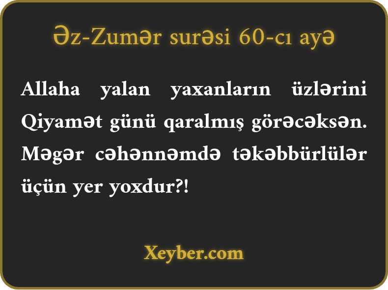 Allaha yalan yaxanların üzlərini Qiyamət günü qaralmış görəcəksən. Məgər cəhənnəmdə təkəbbürlülər üçün yer yoxdur?!