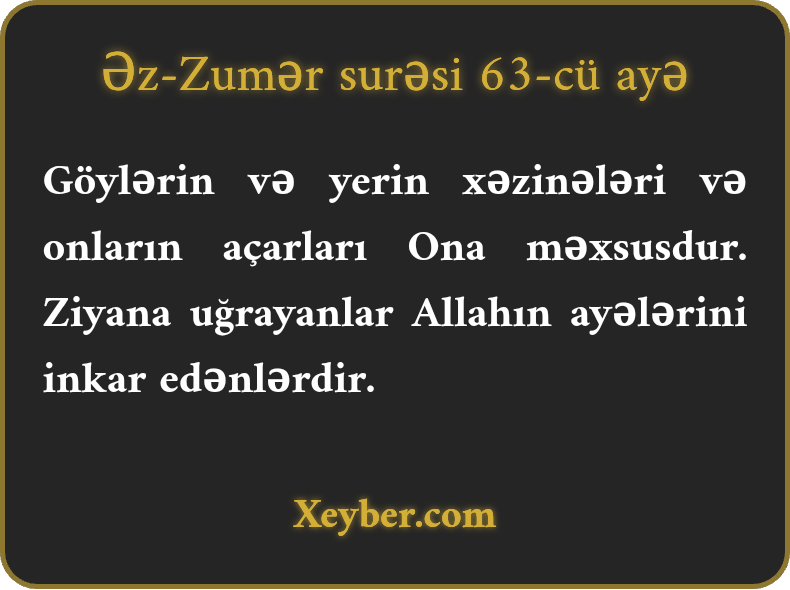 Göylərin və yerin xəzinələri və onların açarları Ona məxsusdur. Ziyana uğrayanlar Allahın ayələrini inkar edənlərdir.