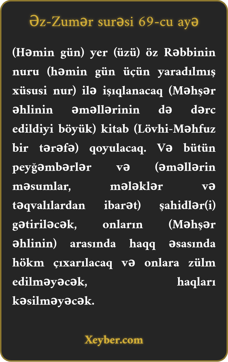 (Həmin gün) yer (üzü) öz Rəbbinin nuru (həmin gün üçün yaradılmış xüsusi nur) ilə işıqlanacaq (Məhşər əhlinin əməllərinin də dərc edildiyi böyük) kitab (Lövhi-Məhfuz bir tərəfə) qoyulacaq. Və bütün peyğəmbərlər və (əməllərin məsumlar, mələklər və təqvalılardan ibarət) şahidlər(i) gətiriləcək, onların (Məhşər əhlinin) arasında haqq əsasında hökm çıxarılacaq və onlara zülm edilməyəcək, haqları kəsilməyəcək.