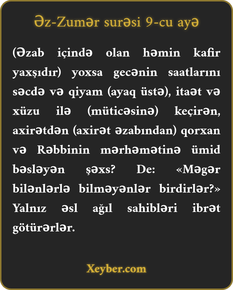 (Əzab içində olan həmin kafir yaxşıdır) yoxsa gecənin saatlarını səcdə və qiyam (ayaq üstə), itaət və xüzu ilə (müticəsinə) keçirən, axirətdən (axirət əzabından) qorxan və Rəbbinin mərhəmətinə ümid bəsləyən şəxs? De: «Məgər bilənlərlə bilməyənlər birdirlər?» Yalnız əsl ağıl sahibləri ibrət götürərlər.