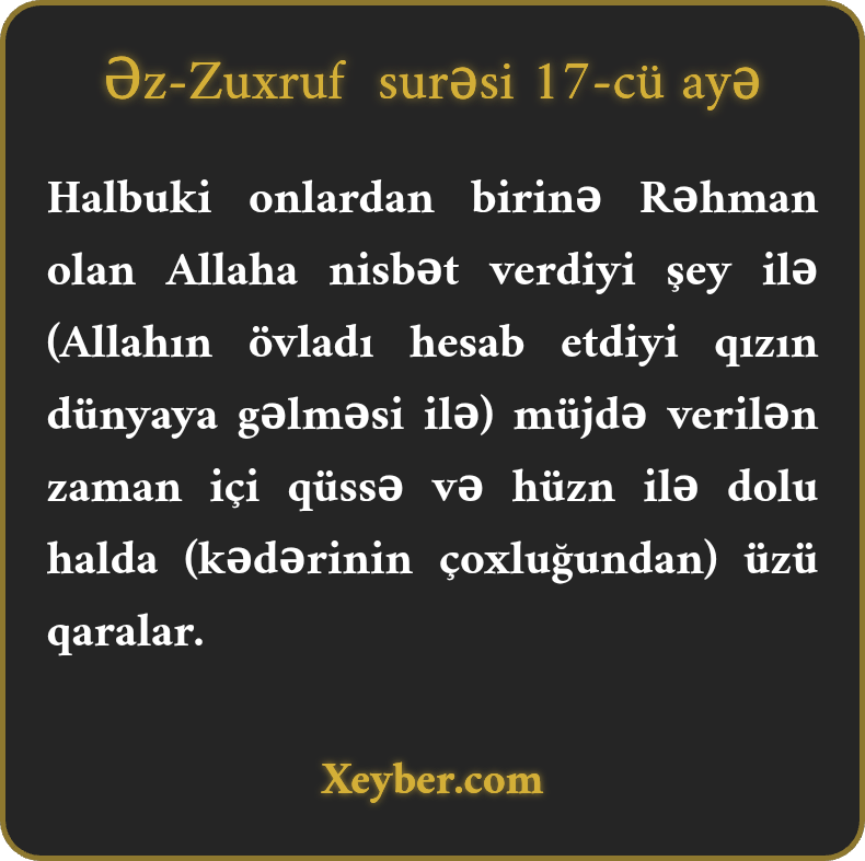 Halbuki onlardan birinə Rəhman olan Allaha nisbət verdiyi şey ilə (Allahın övladı hesab etdiyi qızın dünyaya gəlməsi ilə) müjdə verilən zaman içi qüssə və hüzn ilə dolu halda (kədərinin çoxluğundan) üzü qaralar.