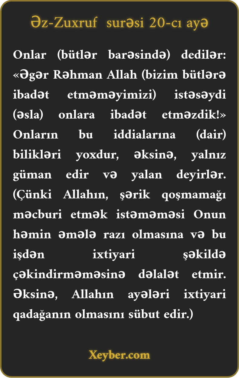 Onlar (bütlər barəsində) dedilər: «Əgər Rəhman Allah (bizim bütlərə ibadət etməməyimizi) istəsəydi (əsla) onlara ibadət etməzdik!» Onların bu iddialarına (dair) bilikləri yoxdur, əksinə, yalnız güman edir və yalan deyirlər. (Çünki Allahın, şərik qoşmamağı məcburi etmək istəməməsi Onun həmin əmələ razı olmasına və bu işdən ixtiyari şəkildə çəkindirməməsinə dəlalət etmir. Əksinə, Allahın ayələri ixtiyari qadağanın olmasını sübut edir.)
