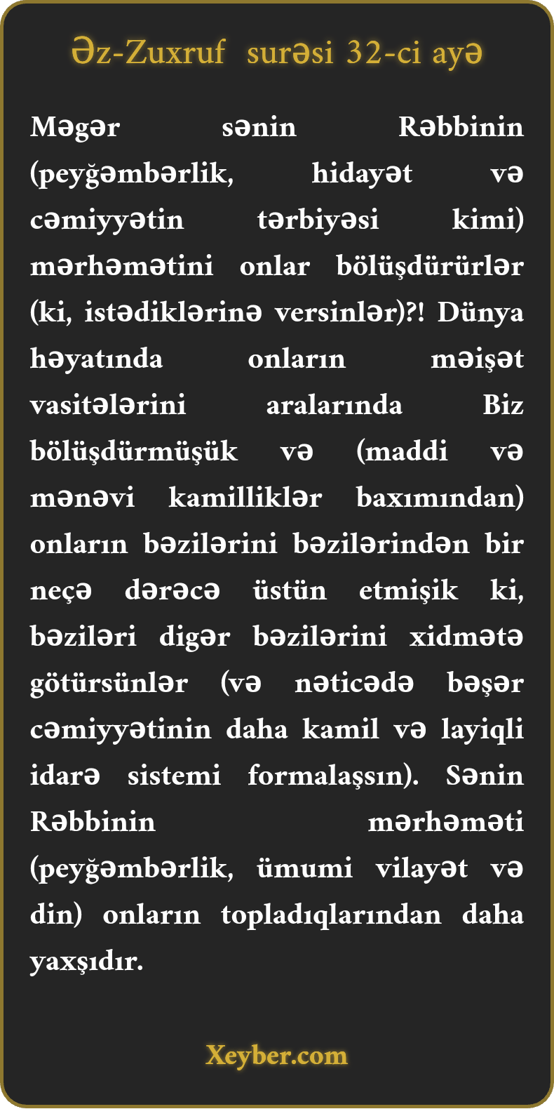 Məgər sənin Rəbbinin (peyğəmbərlik, hidayət və cəmiyyətin tərbiyəsi kimi) mərhəmətini onlar bölüşdürürlər (ki, istədiklərinə versinlər)?! Dünya həyatında onların məişət vasitələrini aralarında Biz bölüşdürmüşük və (maddi və mənəvi kamilliklər baxımından) onların bəzilərini bəzilərindən bir neçə dərəcə üstün etmişik ki, bəziləri digər bəzilərini xidmətə götürsünlər (və nəticədə bəşər cəmiyyətinin daha kamil və layiqli idarə sistemi formalaşsın). Sənin Rəbbinin mərhəməti (peyğəmbərlik, ümumi vilayət və din) onların topladıqlarından daha yaxşıdır.