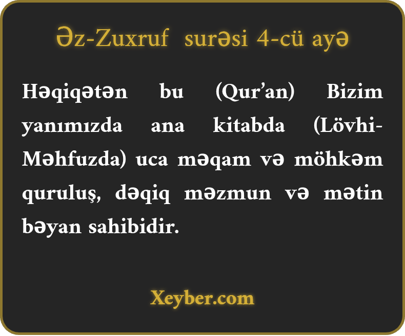 Həqiqətən bu (Qur’an) Bizim yanımızda ana kitabda (Lövhi-Məhfuzda) uca məqam və möhkəm quruluş, dəqiq məzmun və mətin bəyan sahibidir.