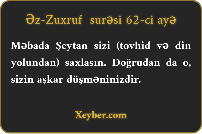 Məbada Şeytan sizi (tovhid və din yolundan) saxlasın. Doğrudan da o, sizin aşkar düşməninizdir.