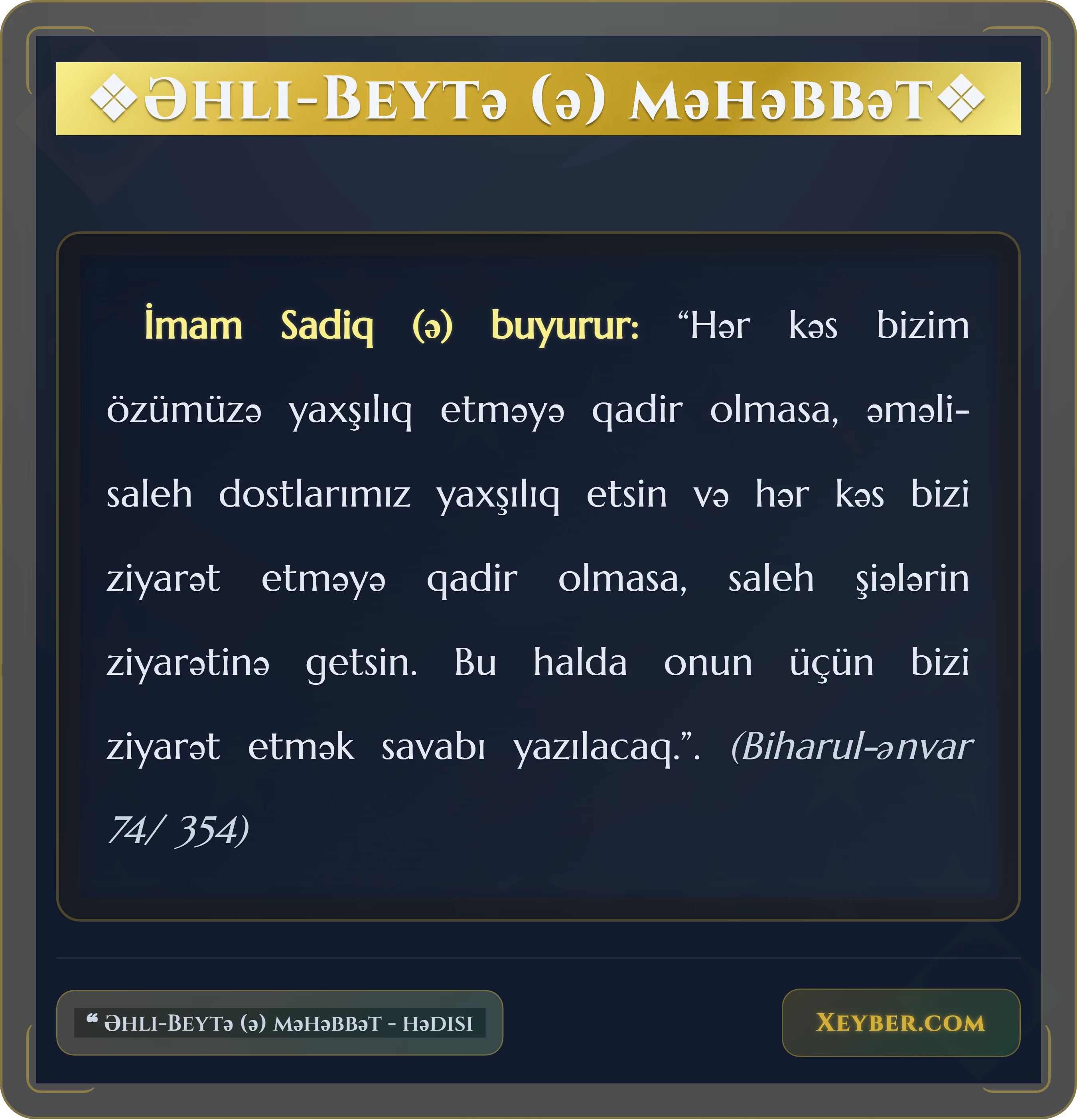 İmam Sadiq (ə) buyurur: “Hər kəs bizim özümüzə yaxşılıq etməyə qadir olmasa, əməli-saleh dostlarımız yaxşılıq etsin və hər kəs bizi ziyarət etməyə qadir olmasa, saleh şiələrin ziyarətinə getsin. Bu halda onun üçün bizi ziyarət etmək savabı yazılacaq.”. (Biharul-ənvar 74/ 354)
