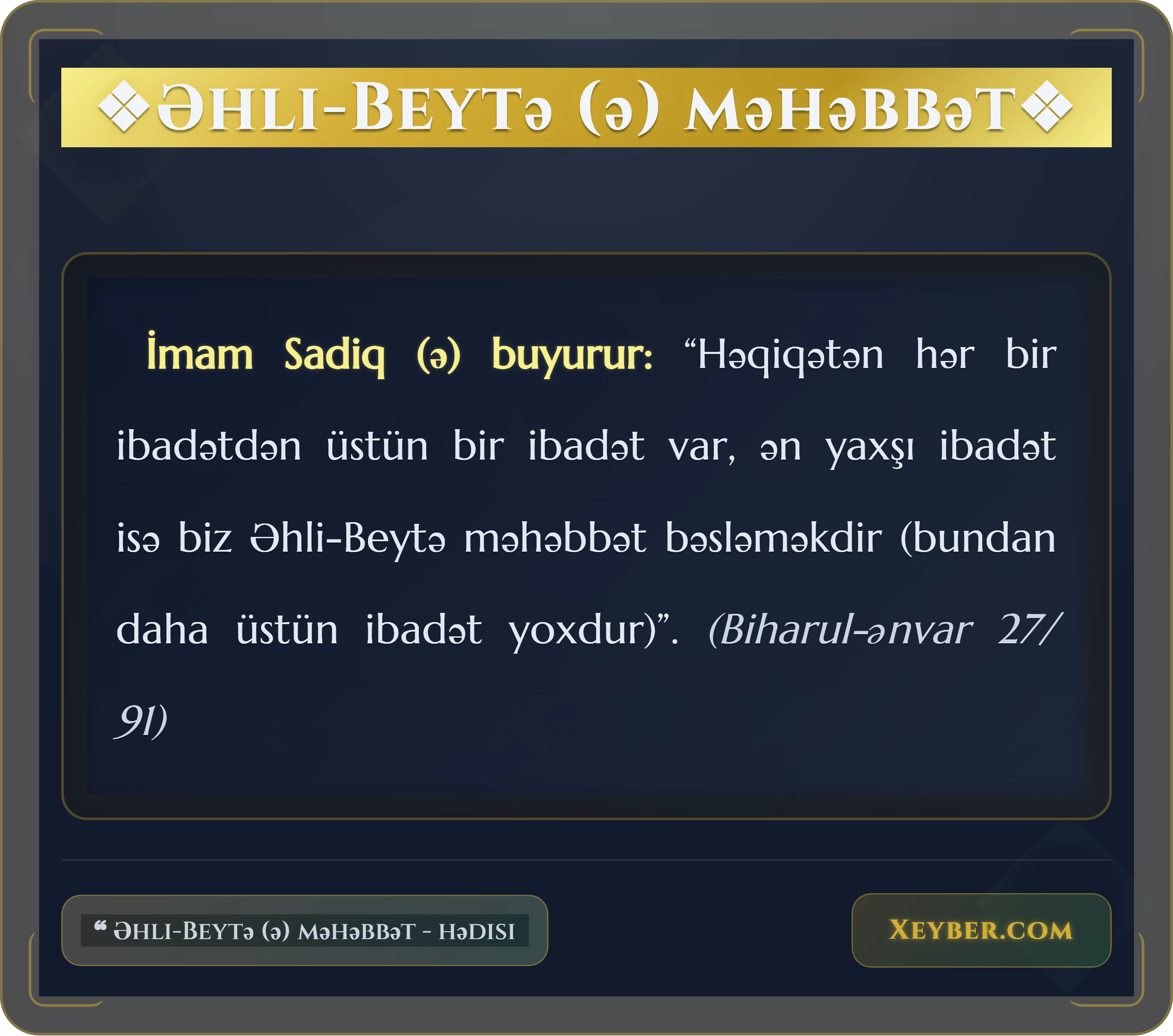 İmam Sadiq (ə) buyurur: “Həqiqətən hər bir ibadətdən üstün bir ibadət var, ən yaxşı ibadət isə biz Əhli-Beytə məhəbbət bəsləməkdir (bundan daha üstün ibadət yoxdur)”. (Biharul-ənvar 27/ 91)