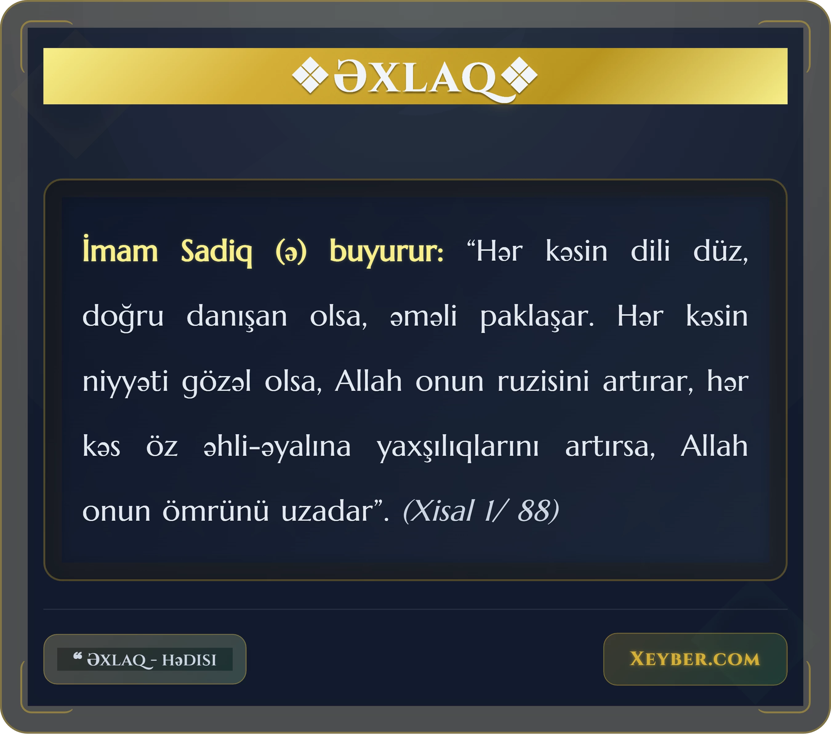 İmam Sadiq (ə) buyurur: “Hər kəsin dili düz, doğru danışan olsa, əməli paklaşar. Hər kəsin niyyəti gözəl olsa, Allah onun ruzisini artırar, hər kəs öz əhli-əyalına yaxşılıqlarını artırsa, Allah onun ömrünü uzadar”. (Xisal 1/ 88)