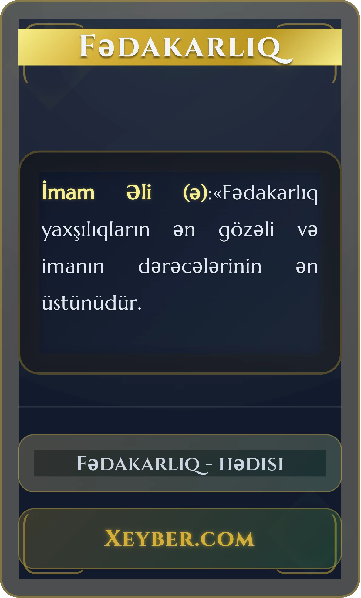 Fədakarlıq Imam Əli (ə) Mizanul – hikmət 11.01.2026 #44 İmam Əli (ə):«Fədakarlıq yaxşılıqların ən gözəli və imanın dərəcələrinin ən üstünüdür. Şəkil yüklənir... Hədisi paylaş: