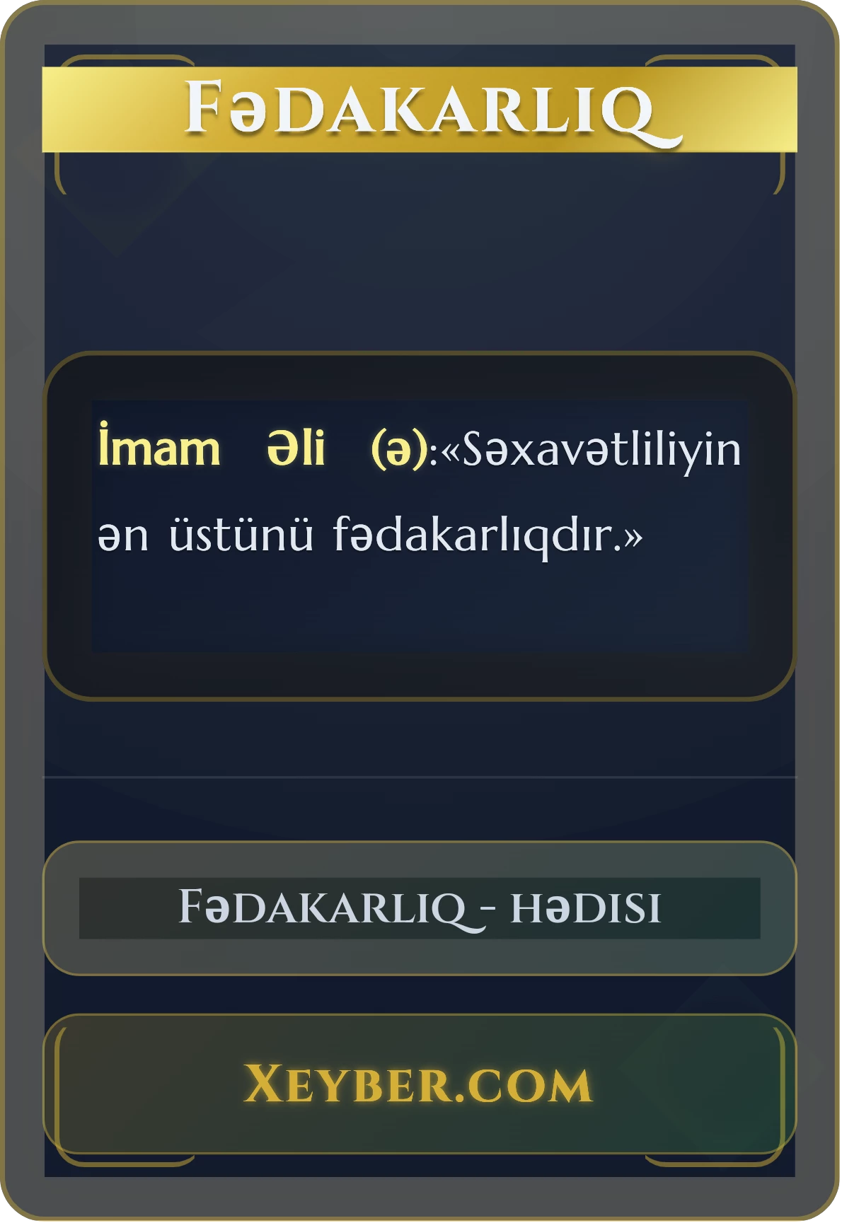 Fədakarlıq Imam Əli (ə) İmam Əli (ə):«Başqaları ilə insafla, möminlərlə isə fədakarlıqla davran.» ...