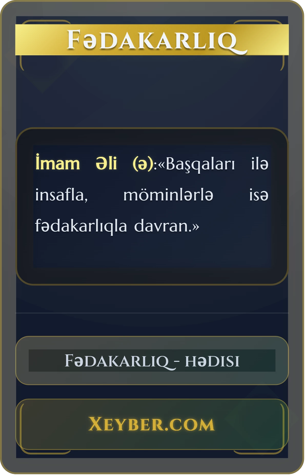 Fədakarlıq Imam Əli (ə) Mizanul – hikmət 13.01.2026 #48 İmam Əli (ə):«Başqaları ilə insafla, möminlərlə isə fədakarlıqla davran.» Şəkil yüklənir... Hədisi paylaş: