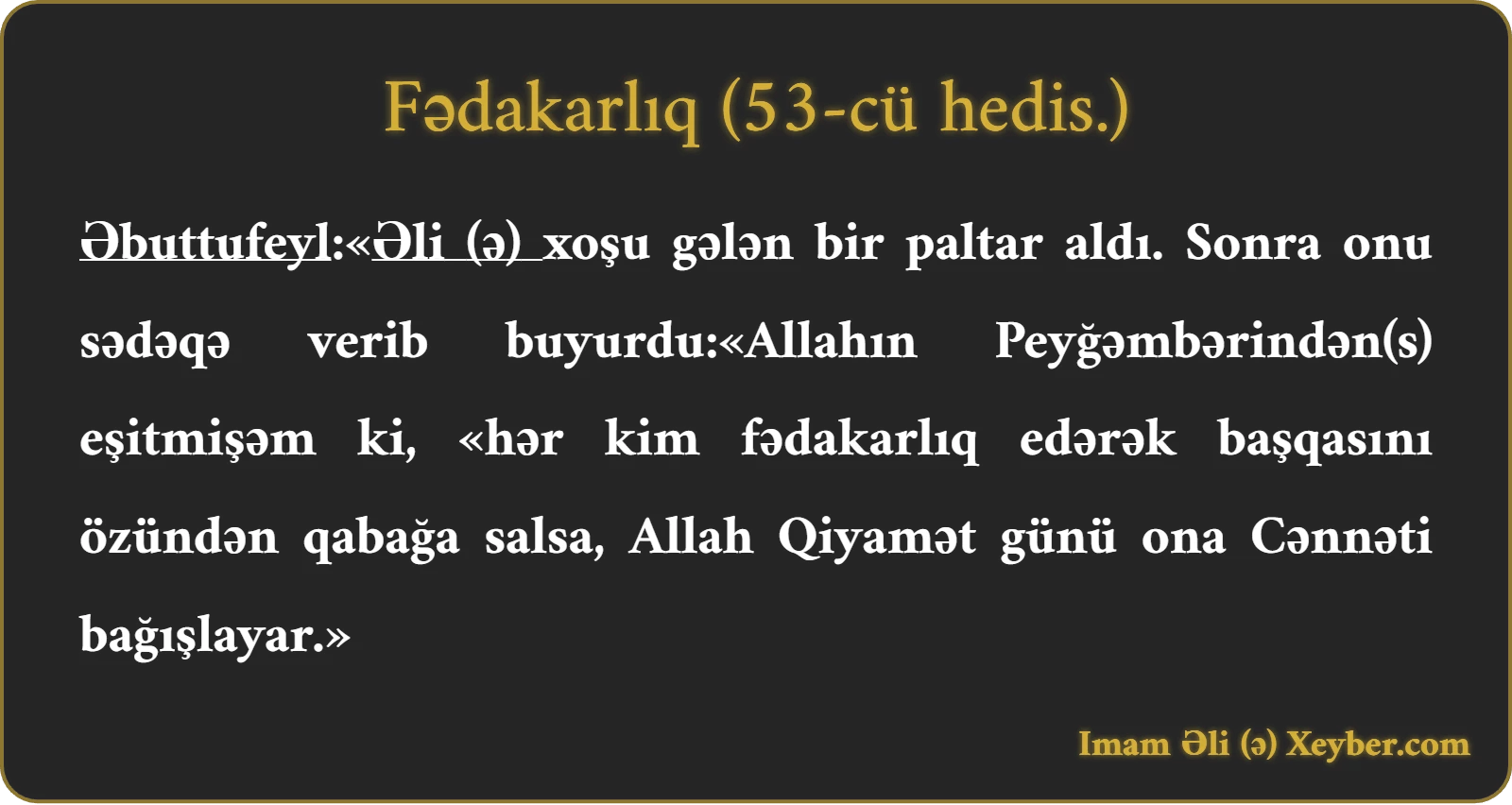 Əbuttufeyl:«Əli (ə) xoşu gələn bir paltar aldı. Sonra onu sədəqə verib buyurdu:«Allahın Peyğəmbərindən(s) eşitmişəm ki, «hər kim fədakarlıq edərək başqasını özündən qabağa salsa, Allah Qiyamət günü ona Cənnəti bağışlayar.»