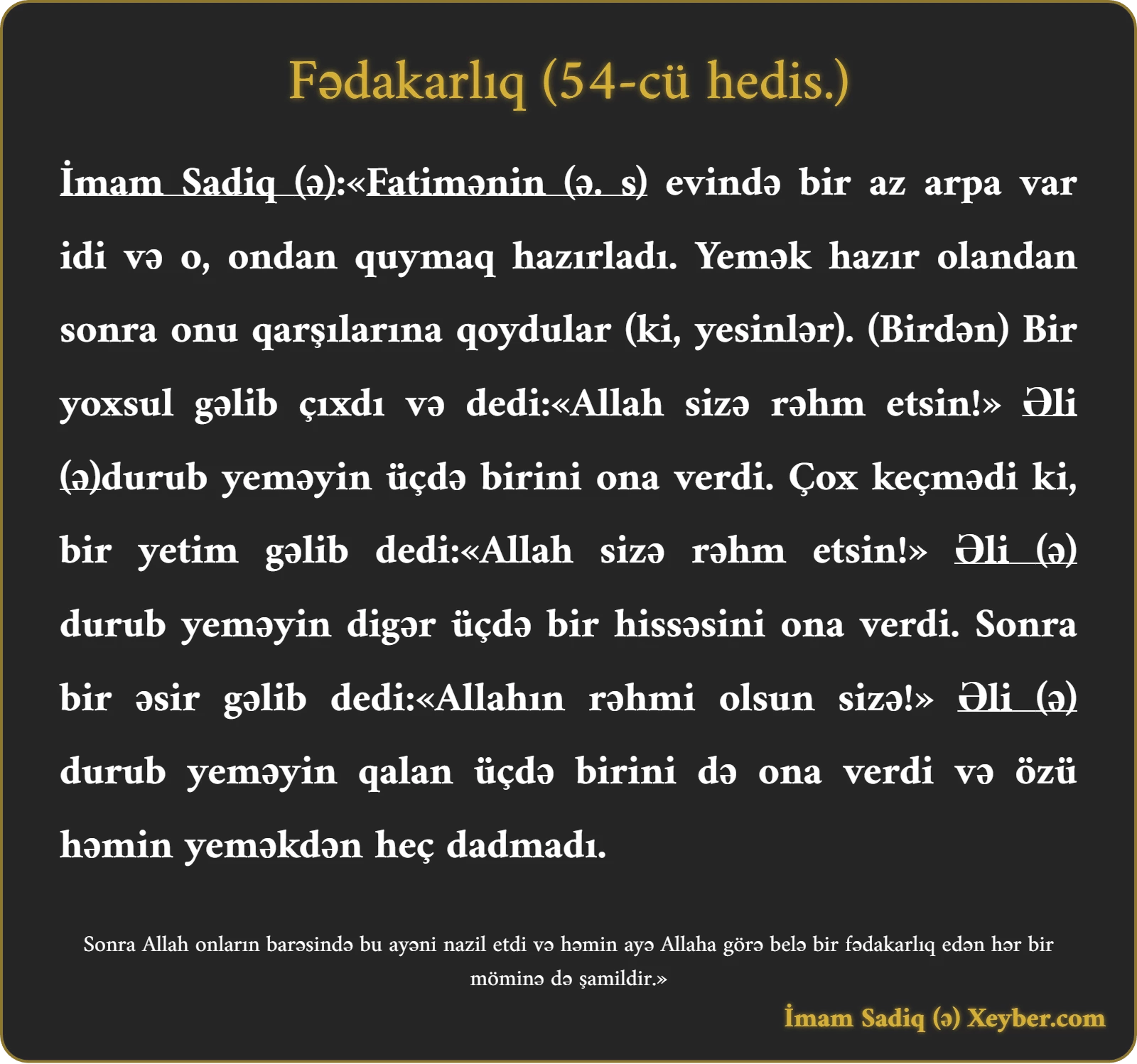 Fatimənin (ə. s) evində bir az arpa var idi və o, ondan quymaq hazırladı. Yemək hazır olandan sonra onu qarşılarına qoydular (ki, yesinlər). (Birdən) Bir yoxsul gəlib çıxdı və dedi:«Allah sizə rəhm etsin!»