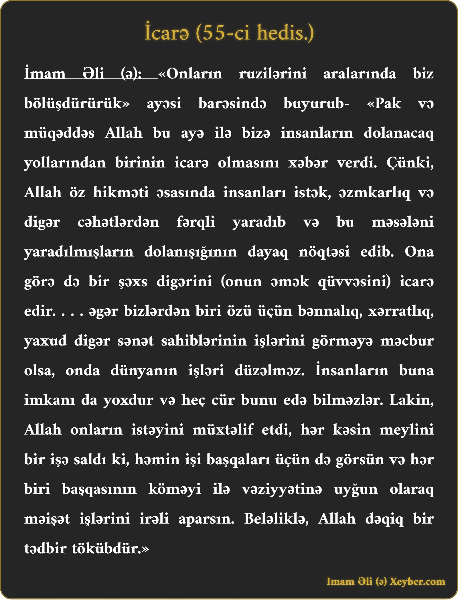 İmam Əli (ə): «Onların ruzilərini aralarında biz bölüşdürürük» ayəsi barəsində buyurub- «Pak və müqəddəs Allah bu ayə ilə bizə insanların dolanacaq yollarından birinin icarə olmasını xəbər verdi. Çünki, Allah öz hikməti əsasında insanları istək, əzmkarlıq və digər cəhətlərdən fərqli yaradıb və bu məsələni yaradılmışların dolanışığının dayaq nöqtəsi edib. Ona görə də bir şəxs digərini (onun əmək qüvvəsini) icarə edir. . . . əgər bizlərdən biri özü üçün bənnalıq, xərratlıq, yaxud digər sənət sahiblərinin işlərini görməyə məcbur olsa, onda dünyanın işləri düzəlməz. İnsanların buna imkanı da yoxdur və heç cür bunu edə bilməzlər. Lakin, Allah onların istəyini müxtəlif etdi, hər kəsin meylini bir işə saldı ki, həmin işi başqaları üçün də görsün və hər biri başqasının köməyi ilə vəziyyətinə uyğun olaraq məişət işlərini irəli aparsın. Beləliklə, Allah dəqiq bir tədbir tökübdür.»