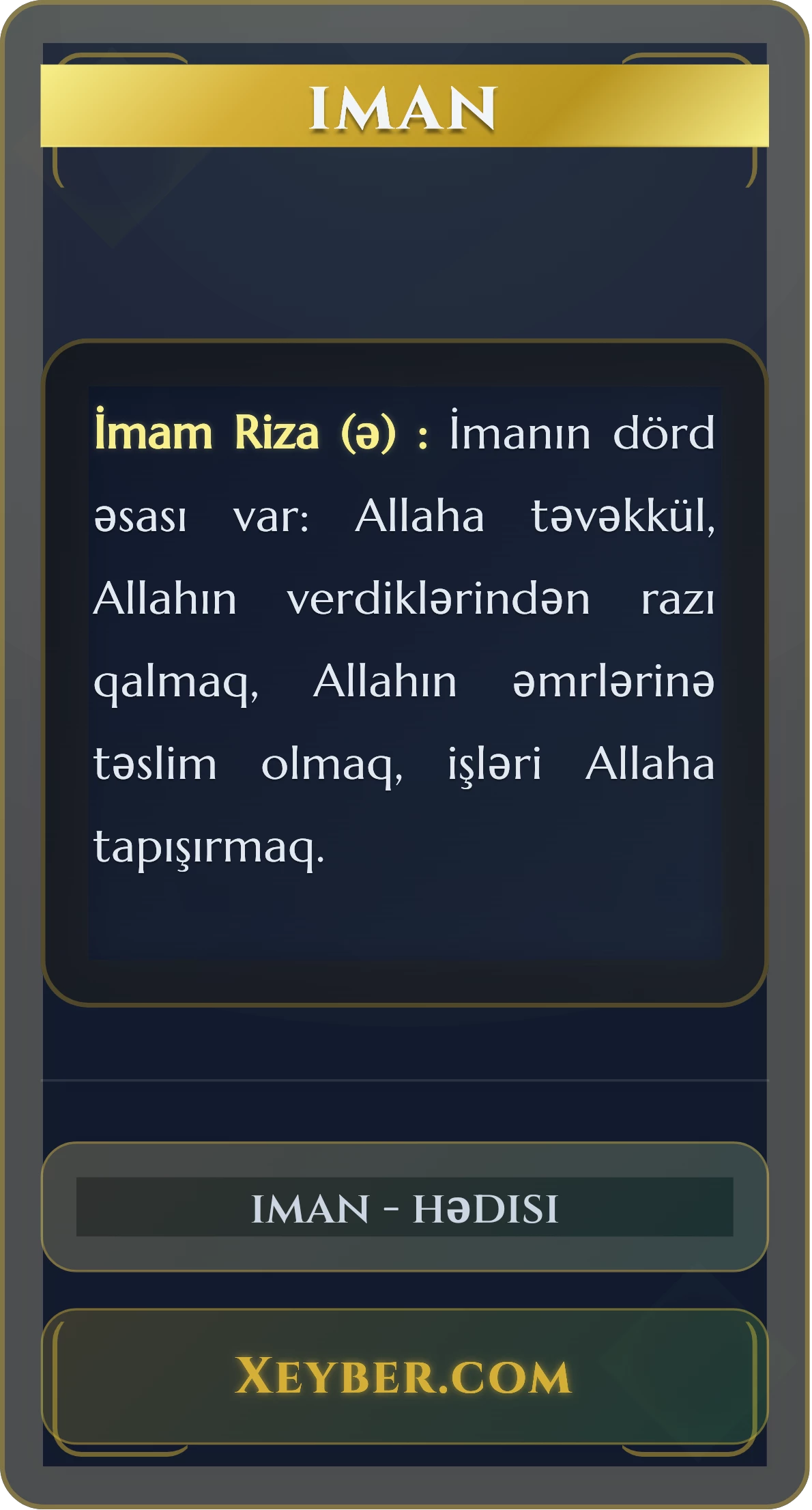 İmam Riza (ə) : İmanın dörd əsası var: Allaha təvəkkül, Allahın verdiklərindən razı qalmaq, Allahın əmrlərinə təslim olmaq, işləri Allaha tapışırmaq.