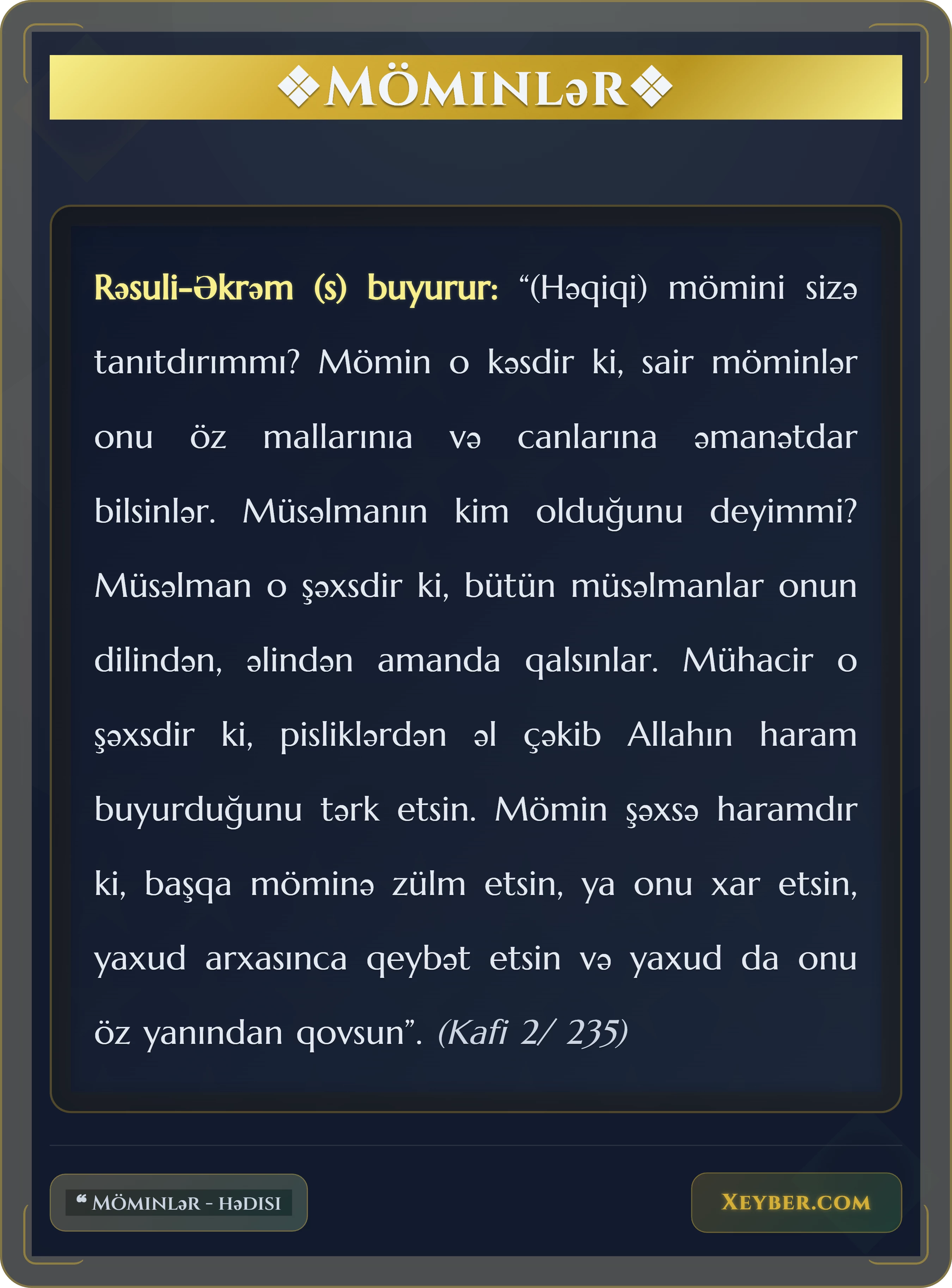Rəsuli-Əkrəm (s) buyurur: “(Həqiqi) mömini sizə tanıtdırımmı? Mömin o kəsdir ki, sair möminlər onu öz mallarınıa və canlarına əmanətdar bilsinlər. Müsəlmanın kim olduğunu deyimmi? Müsəlman o şəxsdir ki, bütün müsəlmanlar onun dilindən, əlindən amanda qalsınlar. Mühacir o şəxsdir ki, pisliklərdən əl çəkib Allahın haram buyurduğunu tərk etsin. Mömin şəxsə haramdır ki, başqa möminə zülm etsin, ya onu xar etsin, yaxud arxasınca qeybət etsin və yaxud da onu öz yanından qovsun”. (Kafi 2/ 235)