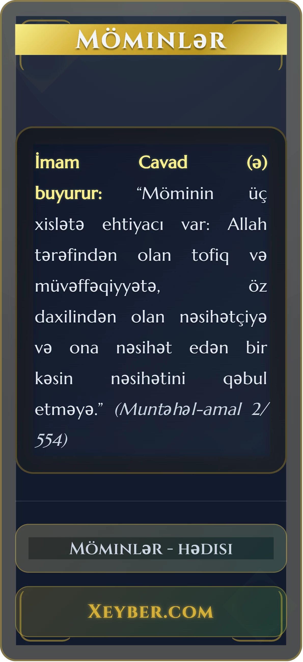 İmam Cavad (ə) buyurur: “Möminin üç xislətə ehtiyacı var: Allah tərəfindən olan tofiq və müvəffəqiyyətə, öz daxilindən olan nəsihətçiyə və ona nəsihət edən bir kəsin nəsihətini qəbul etməyə.” (Muntəhəl-amal 2/ 554)