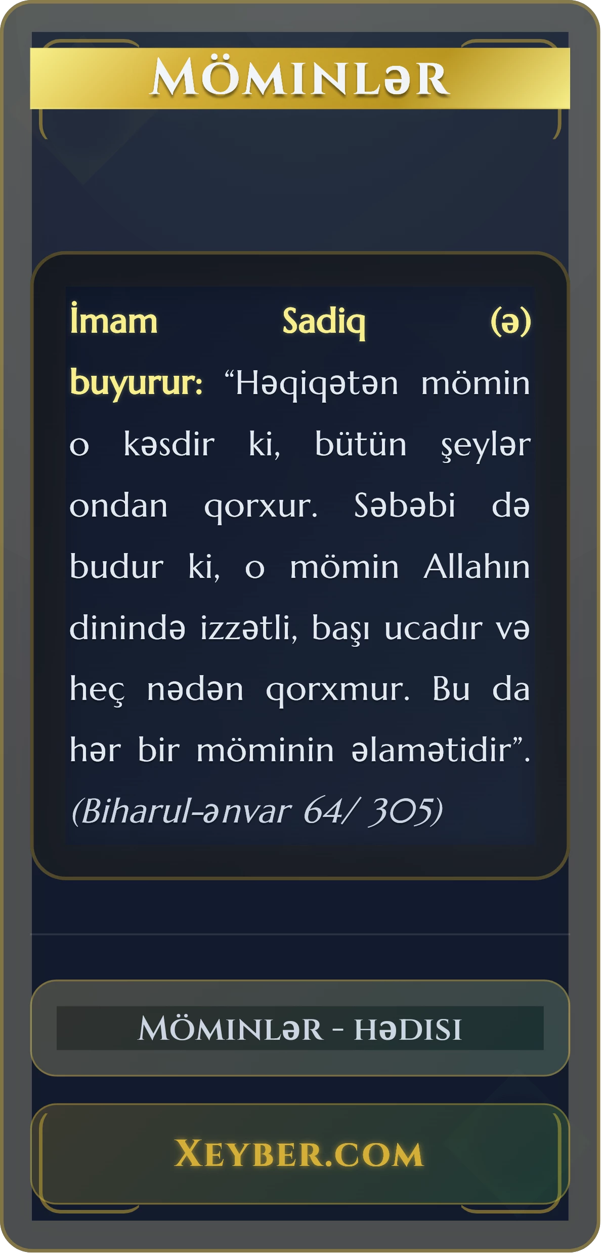 İmam Sadiq (ə) buyurur: “Həqiqətən mömin o kəsdir ki, bütün şeylər ondan qorxur. Səbəbi də budur ki, o mömin Allahın dinində izzətli, başı ucadır və heç nədən qorxmur. Bu da hər bir möminin əlamətidir”. (Biharul-ənvar 64/ 305)
